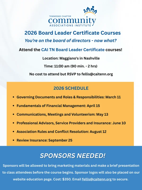 Welcome to the Tennessee Chapter of CAI (Community Associations Institute). We invite you to join our chapter and get involved! CAI TN is dedicated to enhancing the quality of Community Association Living in the State Of Tennessee. We accomplish this through education, legal advocacy, professional development and networking opportunities. Explore our website or call (615) 874-0031 to learn more about joining this award winning chapter of CAI.